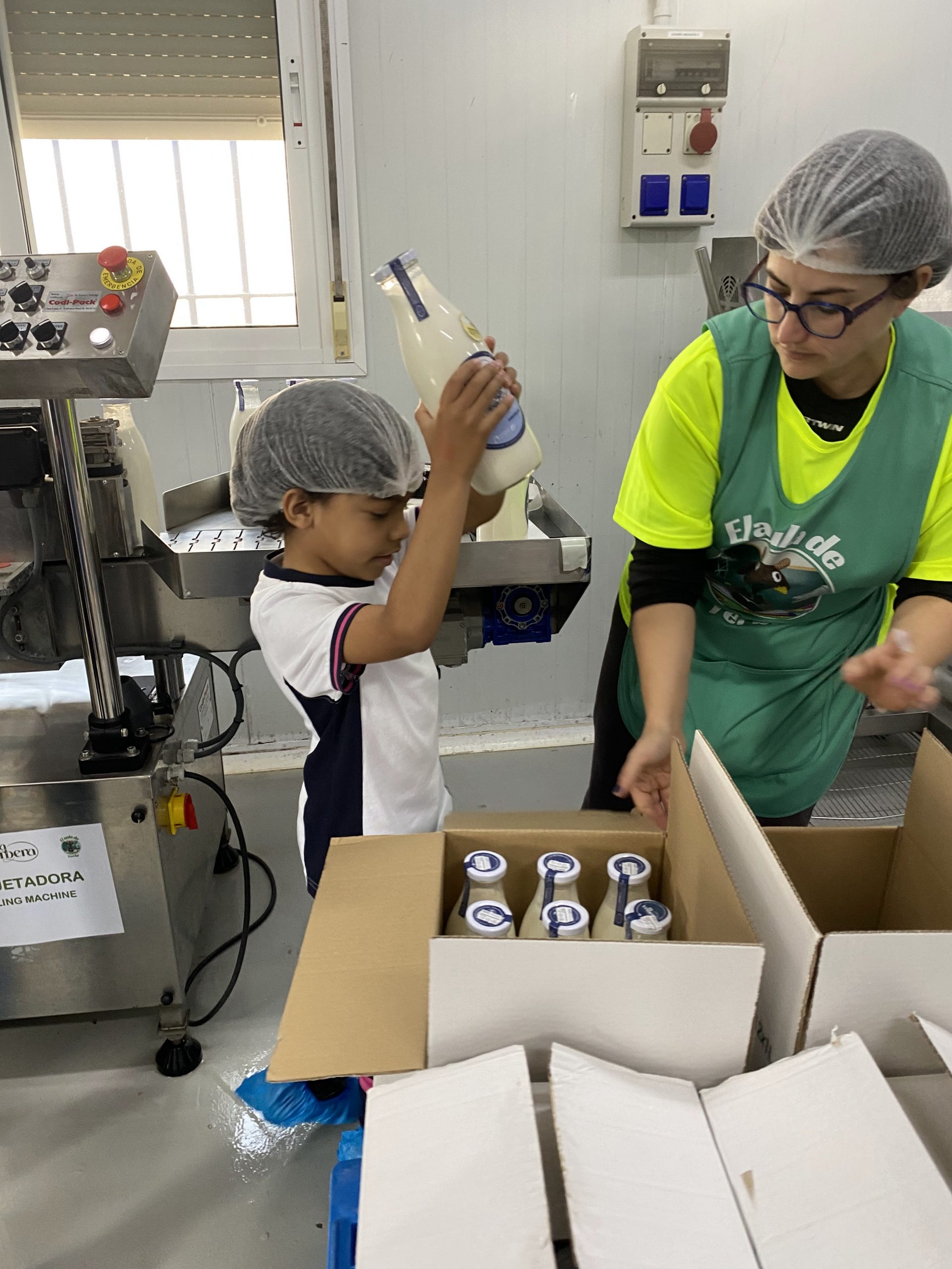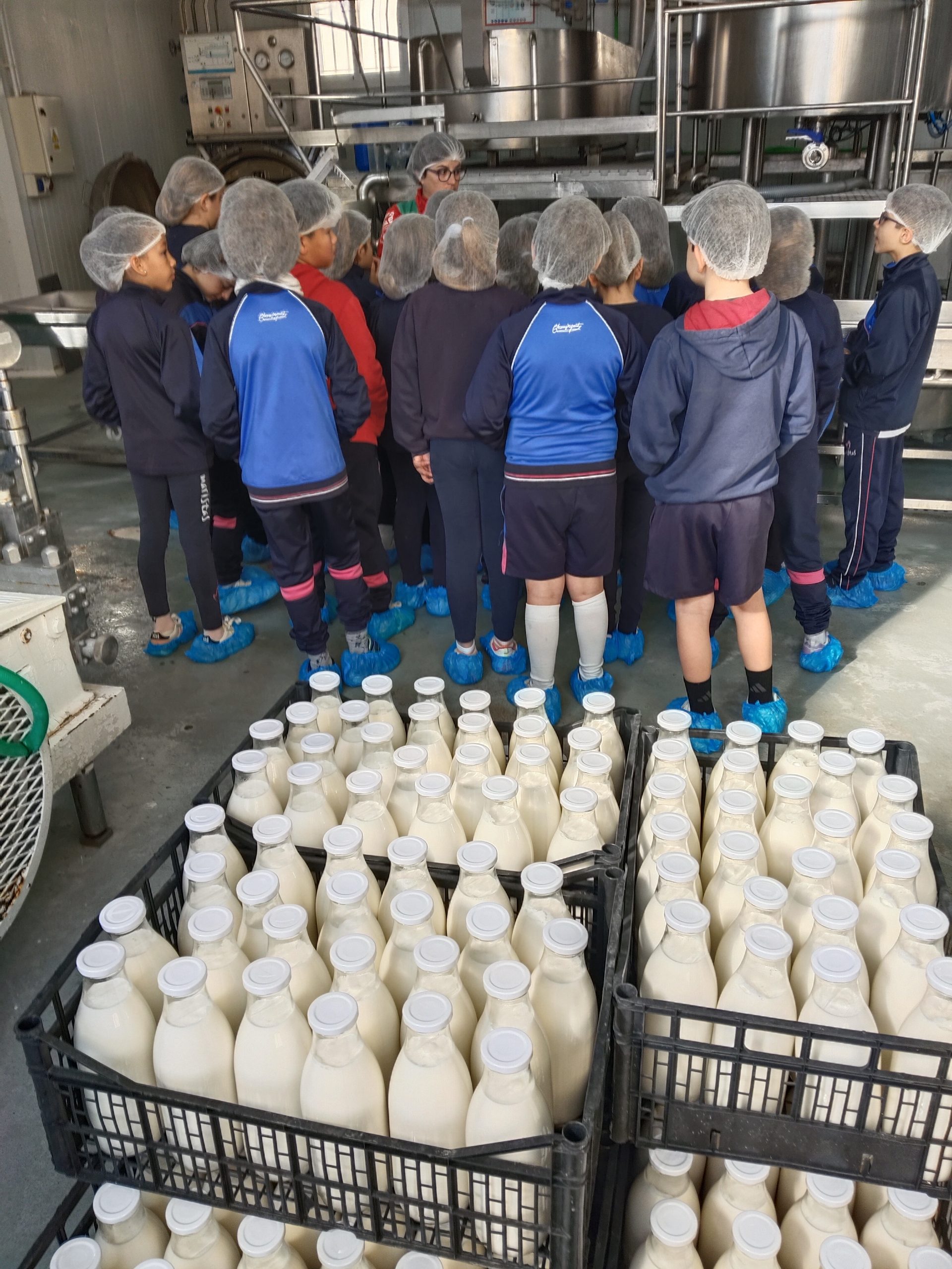 – Del origen a la producción Nada más llegar, los niños pudieron ver el inicio de todo el proceso: el origen de la leche. Aprendieron la importancia del cuidado de los animales y la calidad de la materia prima. Equipados como auténticos profesionales con sus redes y cubre zapatos, entraron en la zona de producción para ver cómo la leche se transforma gracias a la temperatura y el cuajo.